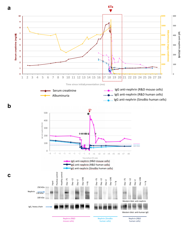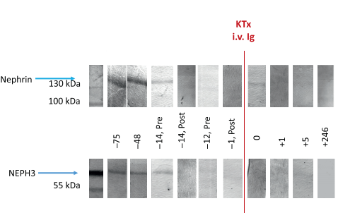 在本案例中,这名来自德国科隆大学医院儿科肾脏病中心的pFSGS儿童患者,由于疾病进展迅速,在发病仅10个月后即被安排接受优先肾移植。为更好地评估FSGS复发风险,临床医生在移植前评估中加入了Nephrin抗体检测,使用免疫沉淀、Western blot和免疫荧光法同步进行动态检测,结果均呈阳性,于是使用利妥昔单抗治疗,尽管两次治疗后CD19⁺B淋巴细胞已被完全且持续抑制,但Nephrin抗体水平在3周后仍高于临界值。随后通过血浆置换清除抗体并取得良好效果(图1a–c、图2)。这名患者随后进行了活体肾移植,移植肾功能立即恢复,无并发症发生。