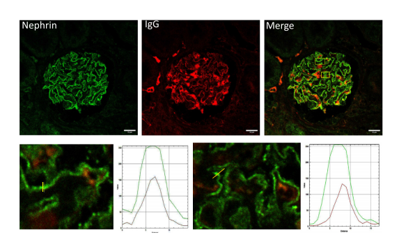 根据国际儿科肾脏病学会关于激素抵抗性肾病综合征的建议,为更好地监测移植肾术后是否出现新发蛋白尿,临床切除了该患者同侧的原生肾。对初始肾活检和肾切除标本进行了Nephrin和IgG的免疫染色分析。在保存较好的肾小球中,可见Nephrin呈不连续线性染色,并与IgG共定位,但染色强度低于原肾活检标本(图3)。截至目前的随访(移植后超过一年),患者移植肾功能保持良好,无蛋白尿,三种检测方法均显示抗体水平持续低于临界值(见图1a)。