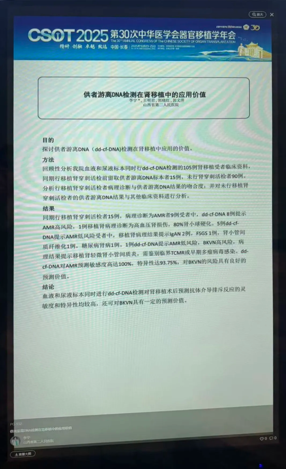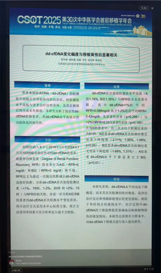 国内器官移植医学领域年度盛会——中华医学会器官移植学分会2025年学术年会(CSOT 2025)于10月23-25日在吉林长春隆重举行。CSOT是中国器官移植领域最高学术水平的盛会,汇聚国内外顶尖专家,共同推动学科发展。本次大会上,奥根诊断及临床合作两项供体来源游离DNA(dd-cfDNA)在肾移植中应用的最新研究成果,分别获大会口头报告与壁报展示交流。